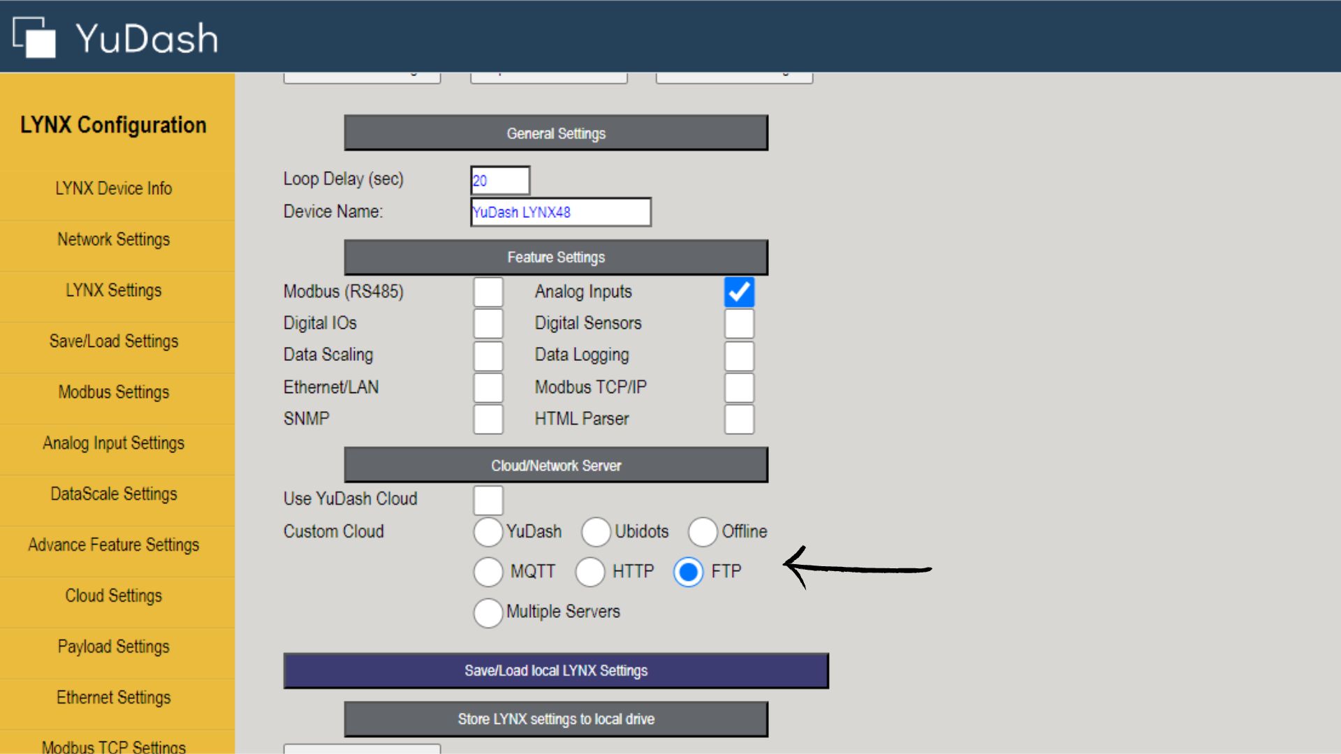 ### Selection of FTP as cloud protocol in YuDash IoT Device