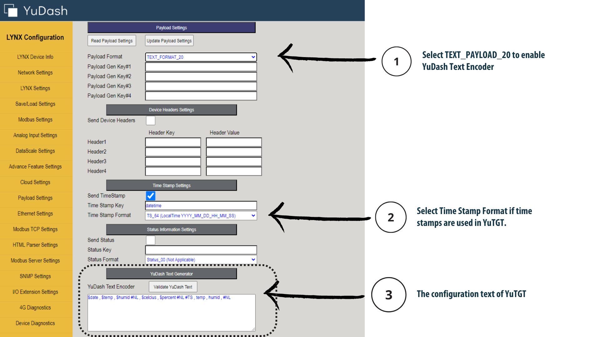 1. Select the payload Format of "TEXT\_FORMAT\_20" to use YuTGT.