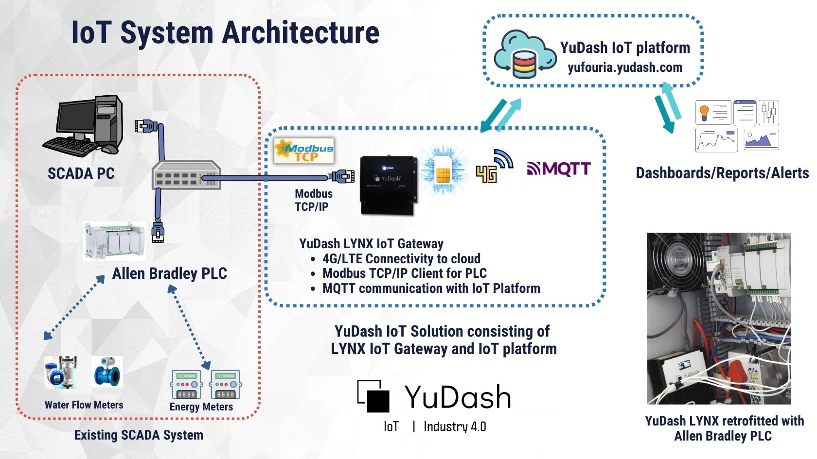 [YuDash LYNX IoT Gateway](https://docs.yudash.com/yudash-iot-devices/lynx-user-manual) was connected on TCP/IP bus with PLC, where LYNX act as [Modbus TCP/IP](https://docs.yudash.com/yudash-iot-devices/lynx-user-manual/lynx-settings/modbus-tcp-ip) Client. YuDash LYNX is connected to [YuDash IoT platform](https://docs.yudash.com/yudash-iot-platform) using [4G/LTE](https://docs.yudash.com/yudash-iot-devices/lynx-user-manual/network-settings) IoT SIM card. LYNX IoT gateway reads PLC at a pre-defined interval (every 10 minutes) and pushes data to YuDash IoT platform. All dashboards and alerts are designed on cloud. Following are the key considerations in this IoT solution being used: