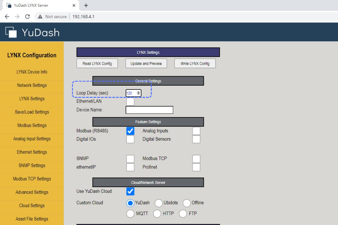 2. After this step, complete LYNX settings are populated. In above example, the loop delay of 60 seconds is set. Modbus/RS485 is enabled and default YuDash cloud is used.