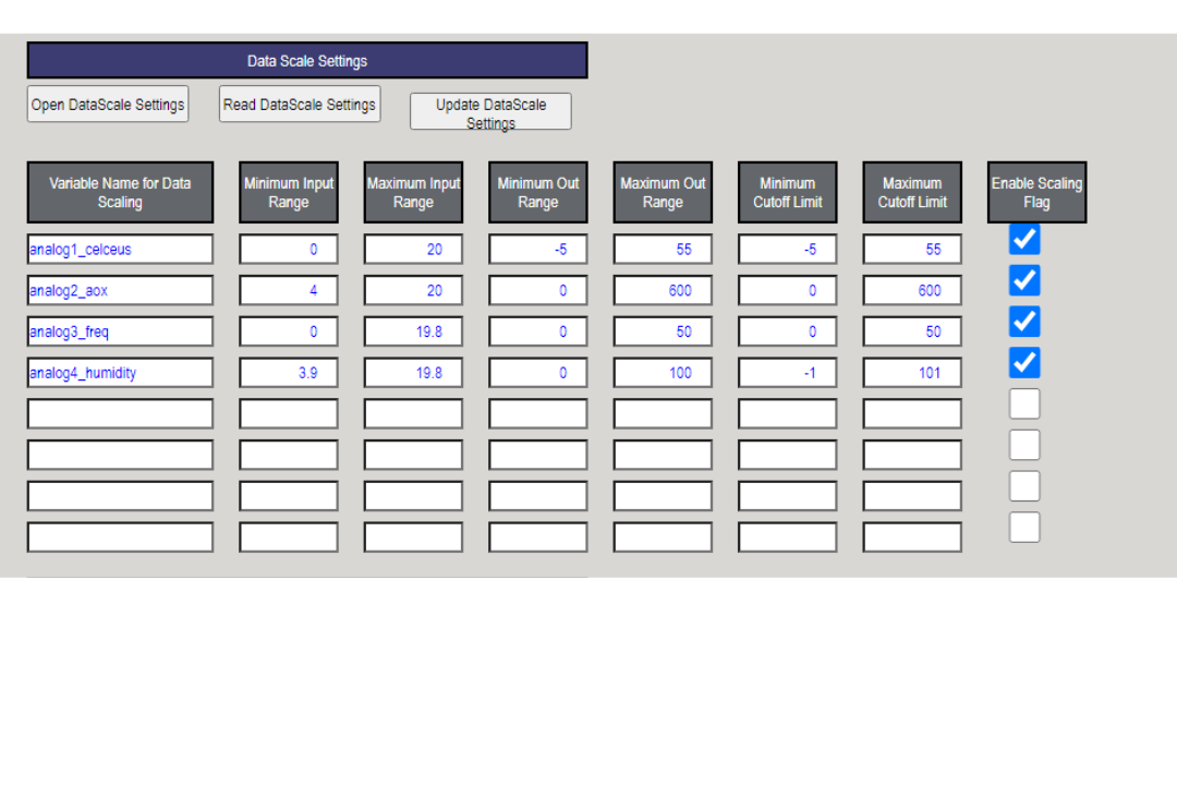 Scaling functions applied to 4 variables (as defined in analog section). **Enable Scaling Flag** has been ticked to have scaling function enabled.